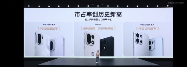 李杰还表示随着一加的产品不断热销,一加的市场份额也再创新高。一加手机三大系列销量和口碑实现双丰收:一加Ace 6系列成为同档销量冠军;一加15成为最畅销的一加数字系列;一加Turbo 6系列成为同档口碑冠军。