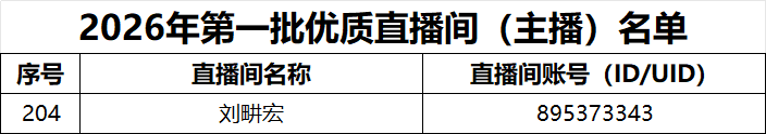 2026年4月15日,由中国网络社会组织联合会组织开展的2026年第一批优质直播间(主播)认定工作已完成公示。该认定工作在中央网信办网络综合治理局指导下,严格依据《优质直播间认定规范》团体标准,经单位推荐、专家评选、第三方机构核查审定等程序,最终形成首批335个优质直播间(主播),巨星传奇旗下艺人刘畊宏成功入围该名单。