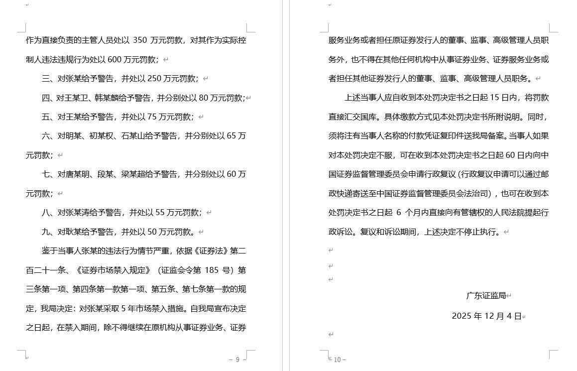 针对以上问题,广东证监局决定对广东华铁通达高铁装备股份有限公司责令改正,给予警告配资平开户,并处以500万元罚款;对宣某国给予警告,并处以950万元罚款;对张某给予警告,处以250万元罚款,并采取5年市场禁入措施;对王某卫、韩某麟给予警告,并分别处以80万元罚款;对王某给予警告,并处以75万元罚款;对明某、初某权、石某山给予警告,并分别处以65万元罚款;对唐某明、段某、梁某超给予警告,并分别处以60万元罚款;对张某涛给予警告,并处以55万元罚款;对耿某给予警告,并处以50万元罚款。
