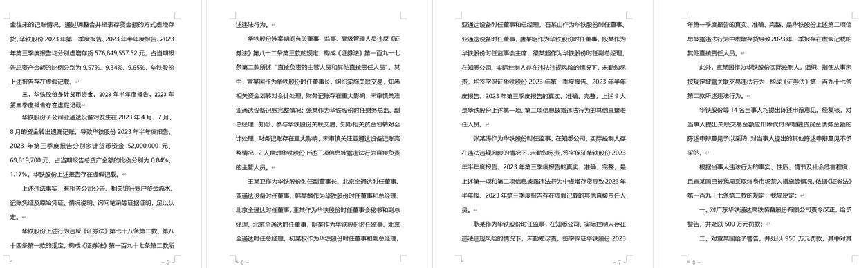决定书显示,广东华铁通达高铁装备股份有限公司存在以下违法事实:华铁股份未按规定披露关联交易,华铁股份2023年半年度报告存在重大遗漏华;华铁股份虚增存货,2023年第一季度报告、2023年半年度报告、2023年第三季度报告存在虚假记载;华铁股份多计货币资金,2023年半年度报告、2023年第三季度报告存在虚假记载。上述行为违反了《证券法》的相关规定。